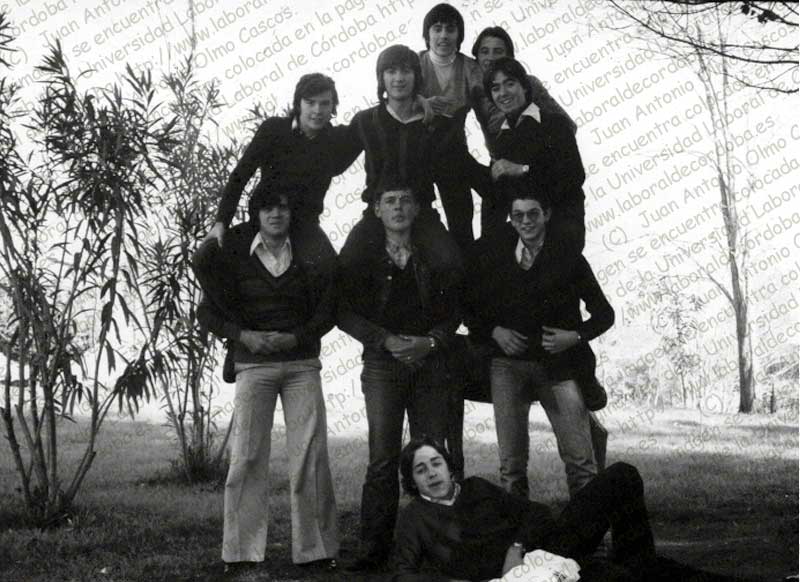 Foto de mis compañeros de curso y aula, en la fachada de la Iglesia. Yo soy el primero por la derecha, con pantalón de color crema y suéter granate, “dando palmas de alegría”, o algo así. |