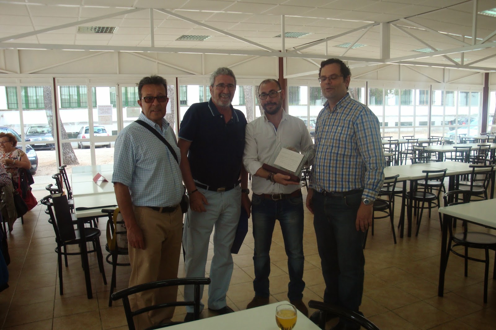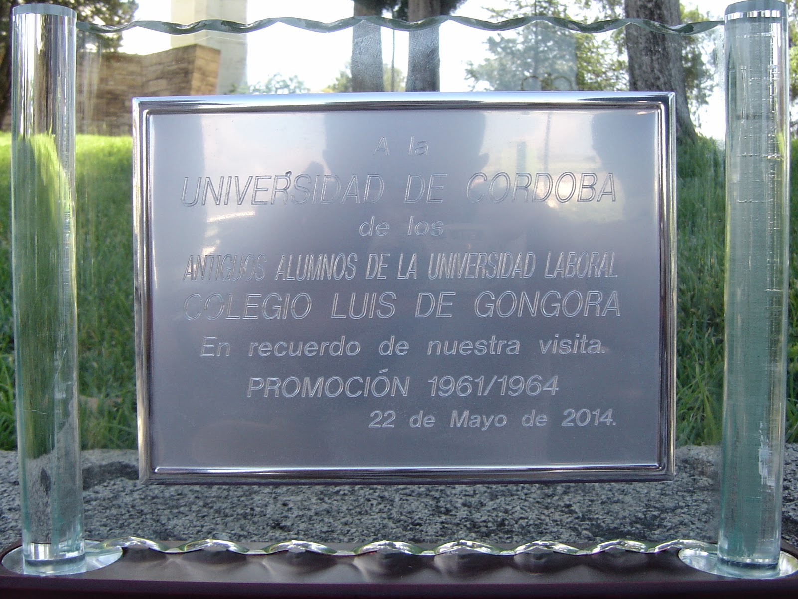 Continuamos la visita, acompañados de Alberto y del jefe de protocolo de la UCO, Francisco Flores, que nos mostraron nuestros antiguos territorios, (dormitorios, aulas, comedor, cines, talleres, etc.,) adaptados a su nueva función, tutorías, laboratorios, biblioteca, preciosa por cierto, etc. etc., finalizando con una comida en el comedor universitario, momento en el que aprovechamos para hacer entrega a nuestro anfitriones de una placa conmemorativa de nuestra visita.